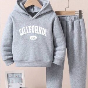 2pcs/Set Tween Boy Casual Letter Print Fleece Hoodie Sweatshirt And Pants, Dark Heather