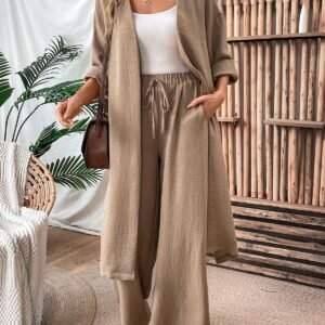 EMERY ROSE Women’s Loose Linen Long Coat And Wide Leg Pants Casual 2pcs Set, Autumn Fall Cloth For Women