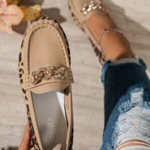 Women’s Metal Chain Decor Flat Loafers, Round Toe Casual Non-Slip Leopard Print Slip-On Flats, Comfortable Spring/Autumn