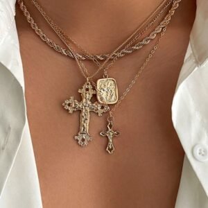 4pcs Vintage Chic Geometric Metal Cross Pendant Necklace Set, Multilayer Charm Necklaces For Men