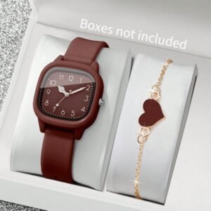 2pcs/Set Women’s Silicone Watch With Square Dial & Elegant Quartz Wristwatch + Heart-Shaped Bracelet, No Watch Box Included