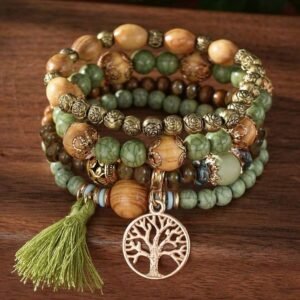 4pcs/Set Bohemian Style Tassel Life Tree Pendant Multi-Layer Wooden Bead Chain Bracelet