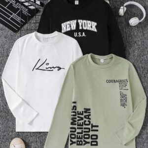 Vacaura 3pcs/Set Teenage Boys Casual Letter Print Crew Neck Long Sleeve T-Shirts, Suitable For Leisure, Street, Commute, Layering In Autumn/Winter Fall