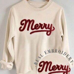 INAWLY Autumn/Winter Merry Embroidery Drop Shoulder Casual Sweatshirt, Happy, Joyful Embroidery Sportwear, Happy Chenille Yarn Sportswear, Christian Gift Customized Personalized Autumn Sweatshirt, Fashionable Autumn/Winter Sweatshirt Gift, Christmas
