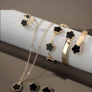 6pcs/Set Necklace, Bracelet, Earrings, Ring, Lucky Flower Necklace, Gold Earrings, Gold Ring, Gold Necklace, Gold Bracelet, Gold Bangle, Girl Jewelry Set, Suitable For Back To School, Party, Holiday