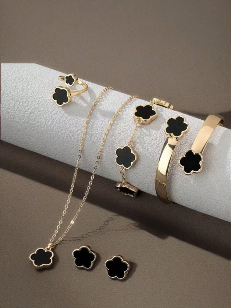 6pcs/Set Necklace, Bracelet, Earrings, Ring, Lucky Flower Necklace, Gold Earrings, Gold Ring, Gold Necklace, Gold Bracelet, Gold Bangle, Girl Jewelry Set, Suitable For Back To School, Party, Holiday