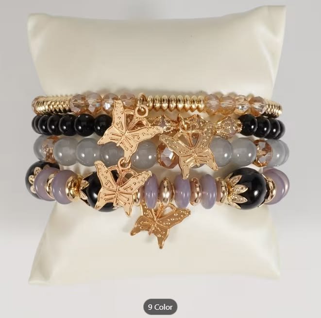 A Set of Four Vintage Bohemian Artificial Crystal Glass CCB Zinc Alloy Butterfly Pendant Layered Beaded Bracelets, Suitable for Women to Wear on a Daily Basis, During Vacations, Weddings, Parties, Celebrations, Christmas, Valentine’S Day