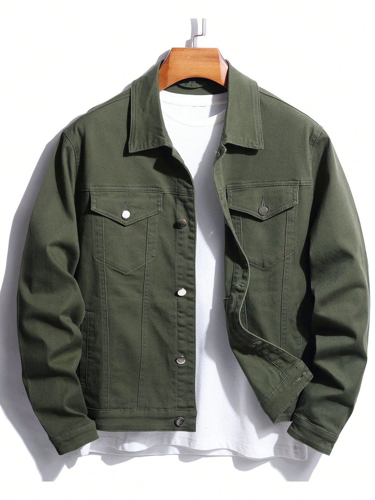 Manfinity Homme Plus Size Men’s Solid Color Cargo Pockets Long Sleeve Plain Casual Dark Denim Jacket, Spring Autumn, For Work Work Going Out Hiking Urban