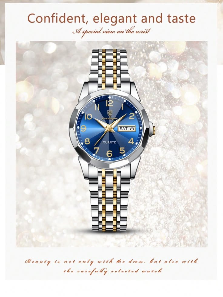 POEDAGAR 1pc Women’s Blue Stainless Steel Elegant Quartz Watches With Waterproof Luminous, Date Week Display Function, Fashion Woman Wristwatch Suitable For Daily Occasions, Ladies Holiday Gifts