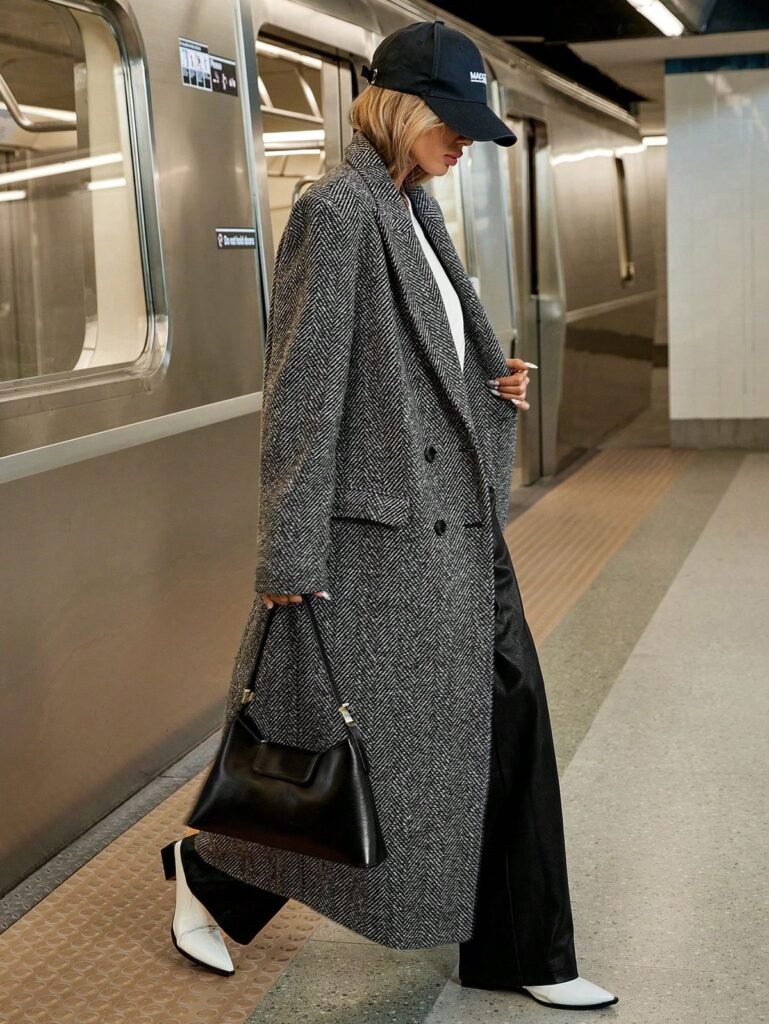 Siren Gaze Women’s Herringbone Pattern Lapel Collar Long Sleeve Long Overcoat, Autumn/Winter Casual